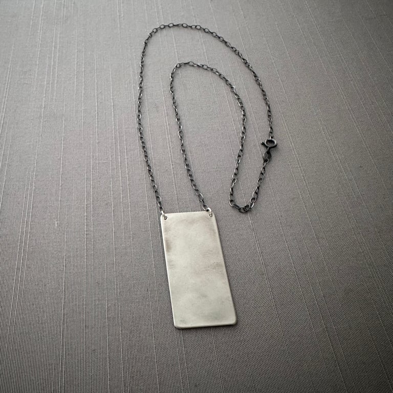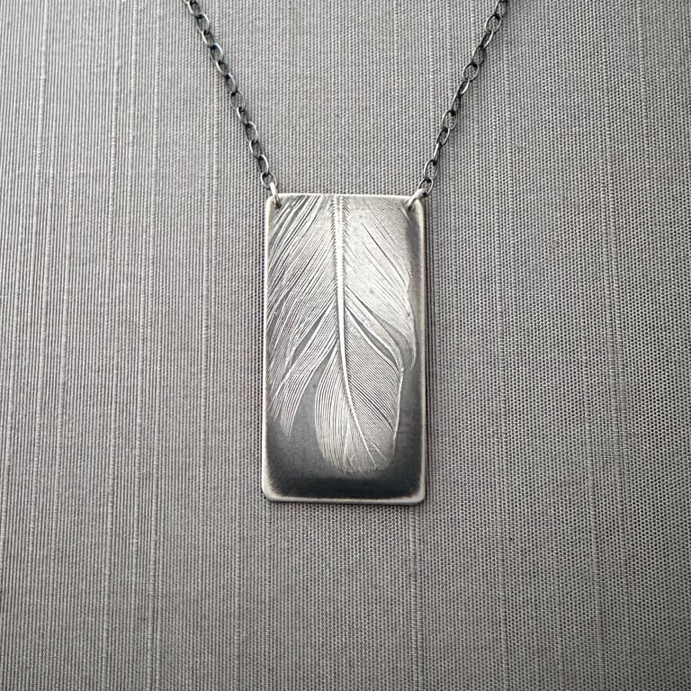 A feather is imprinted into this hand cut, sterling silver rectangle. It has been given an oxidized, brushed finish to highlight the delicate feather texture. This piece measures approximately 1-3/4" x 1". An oxidized sterling silver chain is attached at the top corners.