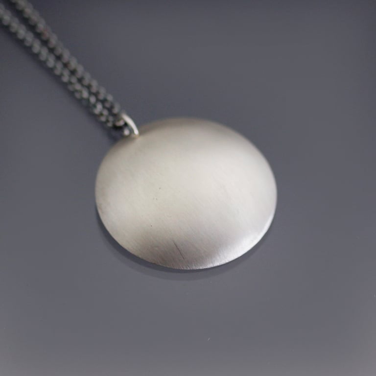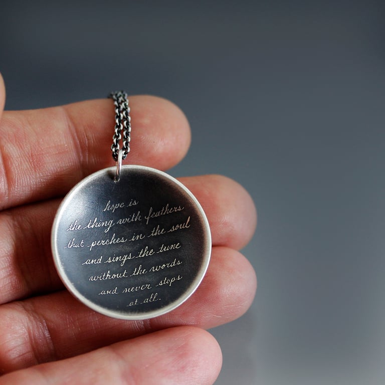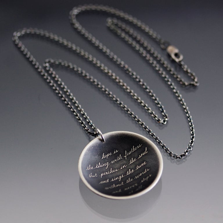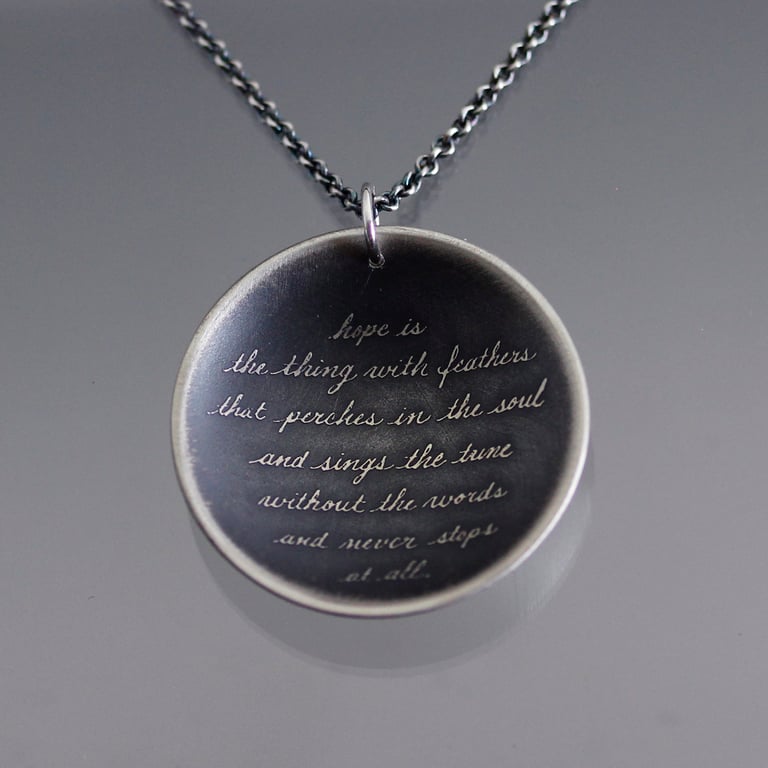 This necklace features a quote by Emily Dickinson that has been handwritten and etched into hand formed, sterling silver saucer pendant: "hope is the thing with feathers that perches in the soul and sings the tune without the words and never stops at all". "E. Dickinson" is etched onto a small, hand cut sterling feather that hangs near the clasp. The piece has been given an oxidized, brushed finish. The pendant measures approximately 1-3/16" in diameter and hangs from an oxidized sterling silver chain.