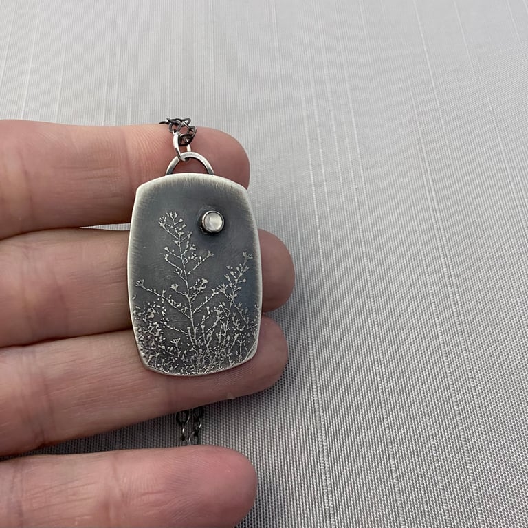 This sterling silver necklace features a 3mm moonstone bezel set above an etched silhouette of health asters just before their fall bloom. This piece has been given an oxidized, brushed finish. It measures 1" x 1-1/2” and hangs from an oxidized sterling silver chain.