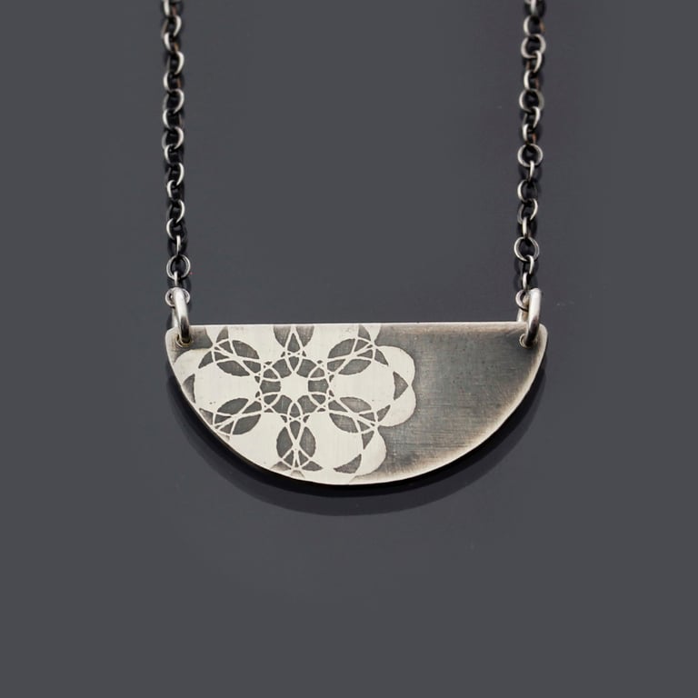 This necklace features a spiro flower design etched into a half-round sterling silver semicircle. It has been given an oxidized, brushed finish. It measures approximately 7/8" across. A sterling silver chain is attached at the corners. The sterling silver chain is available in either an oxidized (darkened) finish or bright silver.