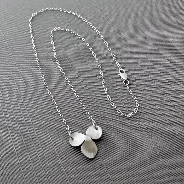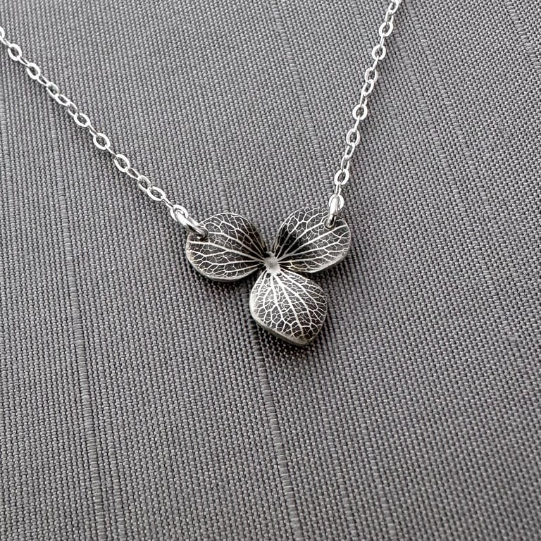 A real, three petal hydrangea blossom is imprinted into sterling silver to create a delicate flower impression. The piece is hand cut and formed to create soft, subtle curves. The pendant has been oxidized and hand finished to highlight the delicate veins of the petals. It has been given a brushed finish. The blossom measures approximately 5/8" across and a sterling silver chain is attached to two petals. The sterling silver chain is available in either a bright silver finish or an oxidized (darkened) finish. The bright silver chain is pictured.