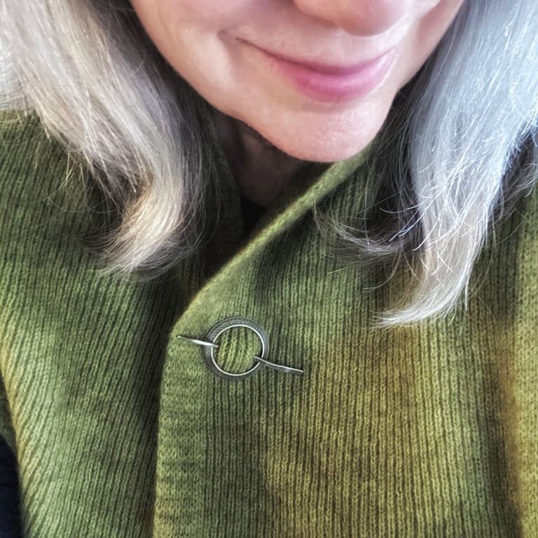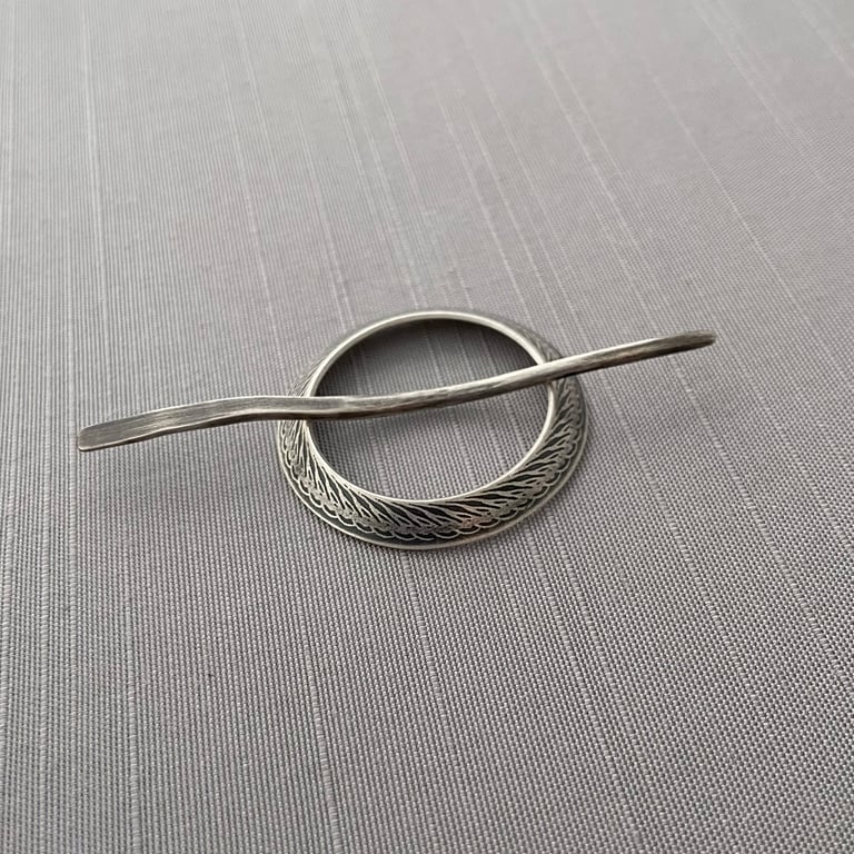 This shawl pin/sweater brooch features my textured design etched into a hand cut, hand formed sterling silver circle. A hand cut, hand hammered pin slides through the brooch to secure it to a shawl or sweater. This piece has been given an oxidized, brushed finish. The circle measures approximately 1-3/8 inches in diameter and the pin is approximately 2-3/4 inches long.