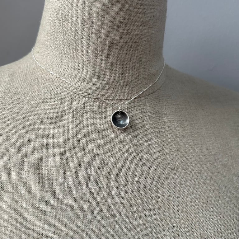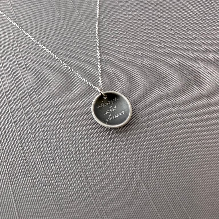 This sterling silver necklace features the words "always and forever" that have been handwritten in calligraphy and etched into a small silver circle. The piece has been given an oxidized, brushed finish. The pendant measures just under 5/8" in diameter and hangs from an oxidized sterling silver chain.