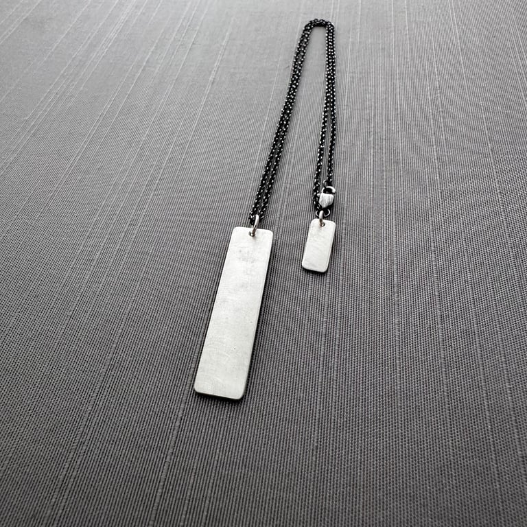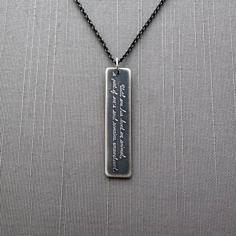 This necklace features a quote by Anatole France that I've handwritten and etched into a hand cut sterling silver pendant: "until one has loved an animal, a part of one’s soul remains unawakened. I have also etched his name, onto a small, hand cut sterling silver rectangle that hangs near the clasp. This piece has been given a rustic, oxidized finish. The pendant measures approximately 1-5/8" x 3/8" and hangs from an oxidized sterling silver chain.