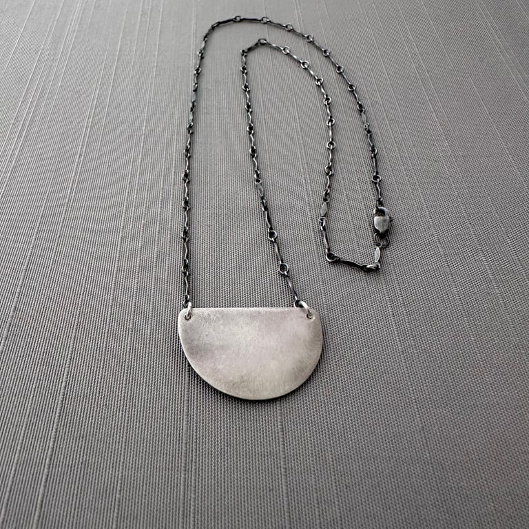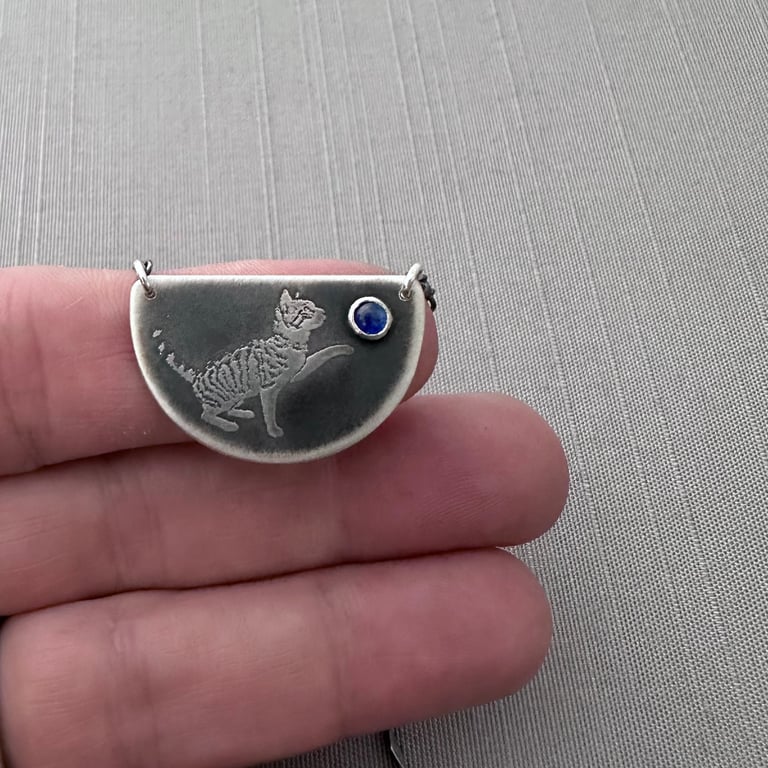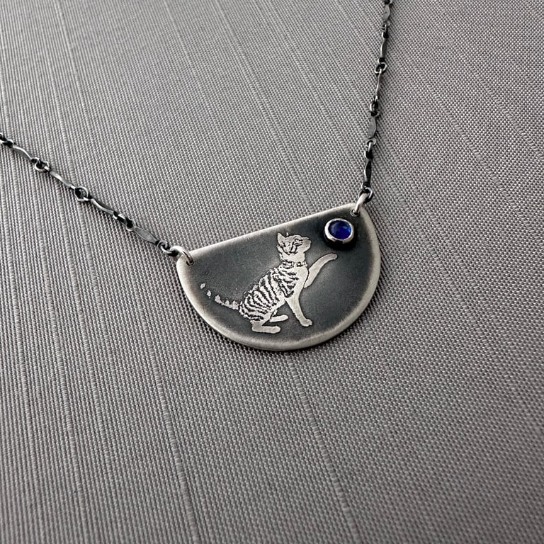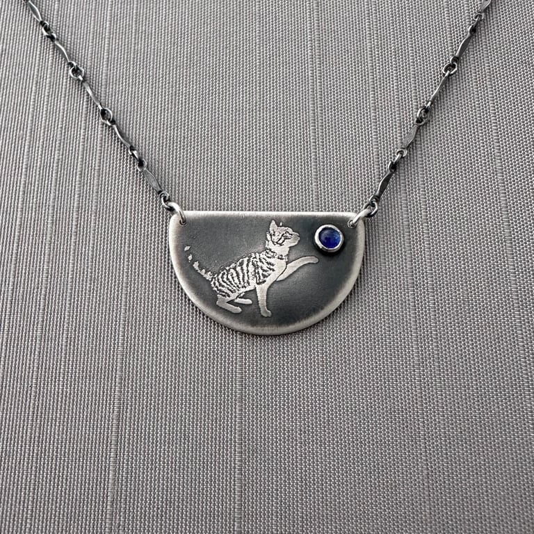 This necklace features my tabby cat illustration etched into sterling silver. I’ve added a 3 mm blue sapphire cabochon to this piece. The piece has been given an oxidized, brushed finish. It measures approximately 3/4" x 1" and hangs from an oxidized sterling silver chain.