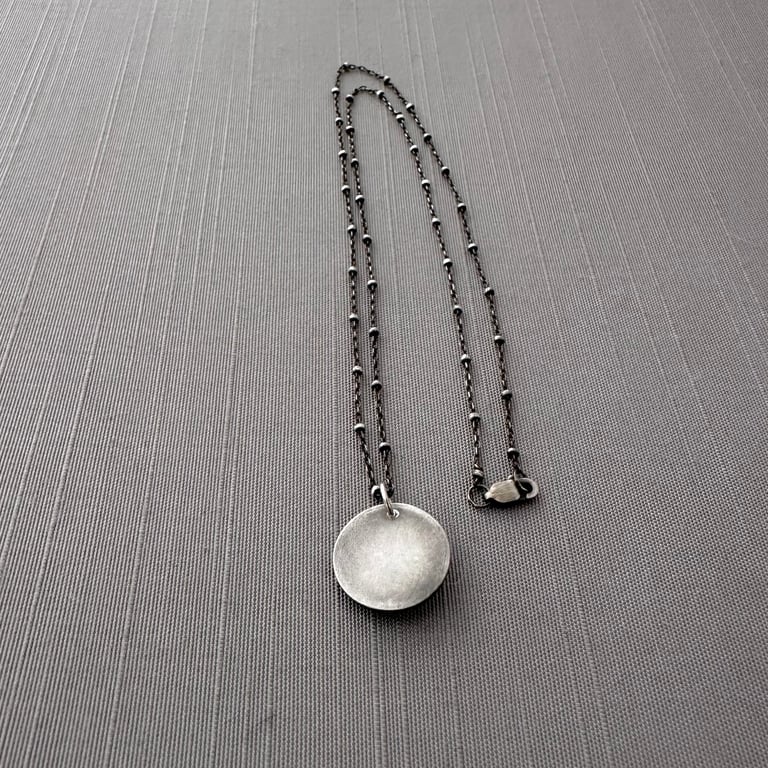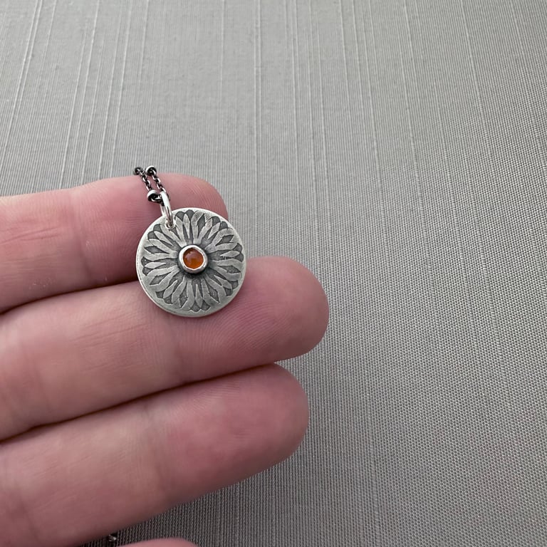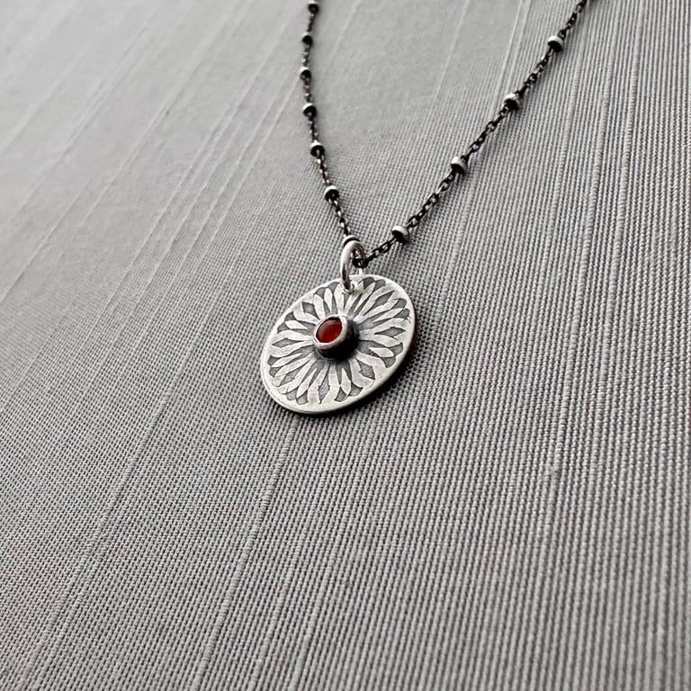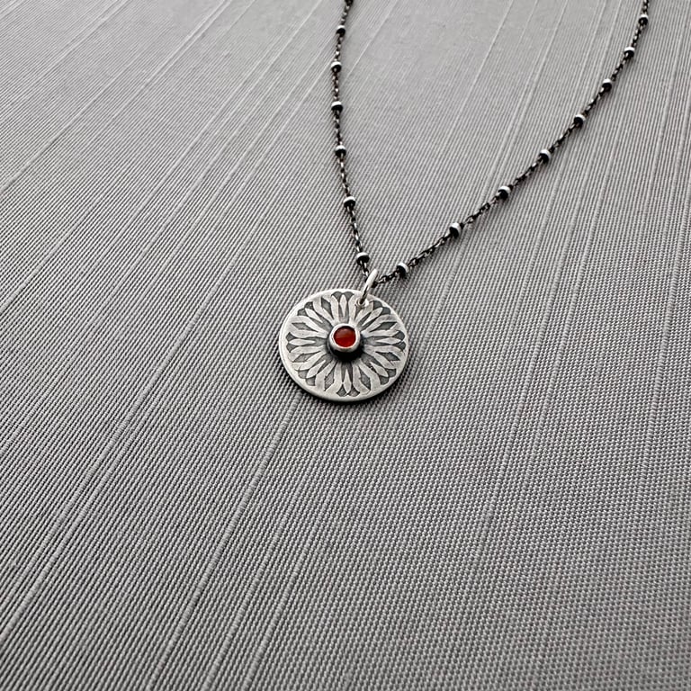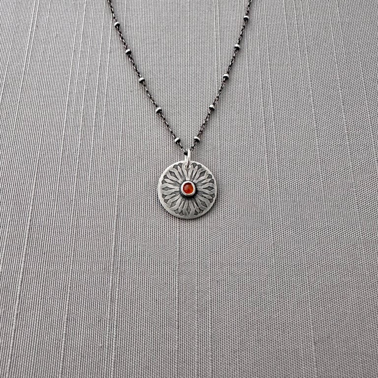My spiroburst design is etched into sterling silver circle with a 3mm carnelian cabochon set within a bezel in the center. I've given it an oxidized, brushed finish. The pendant measures approximately 5/8" in diameter and hangs from an oxidized sterling silver chain.