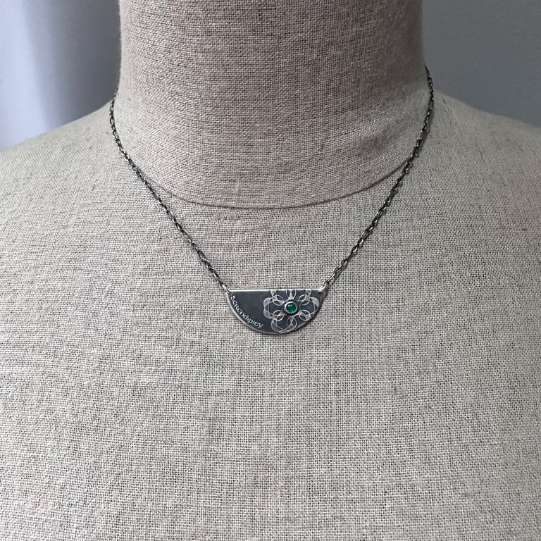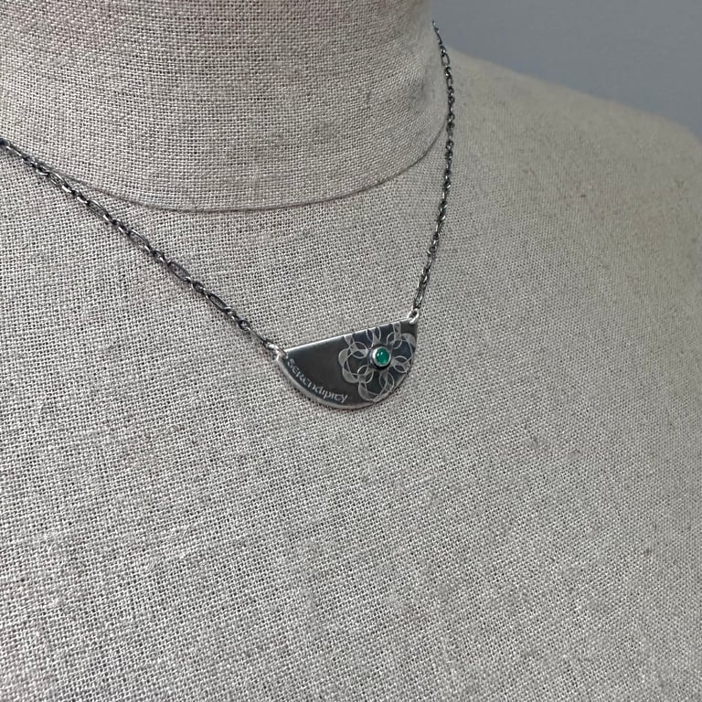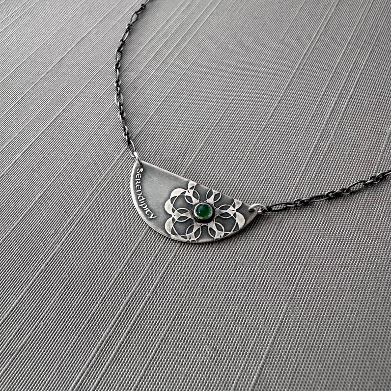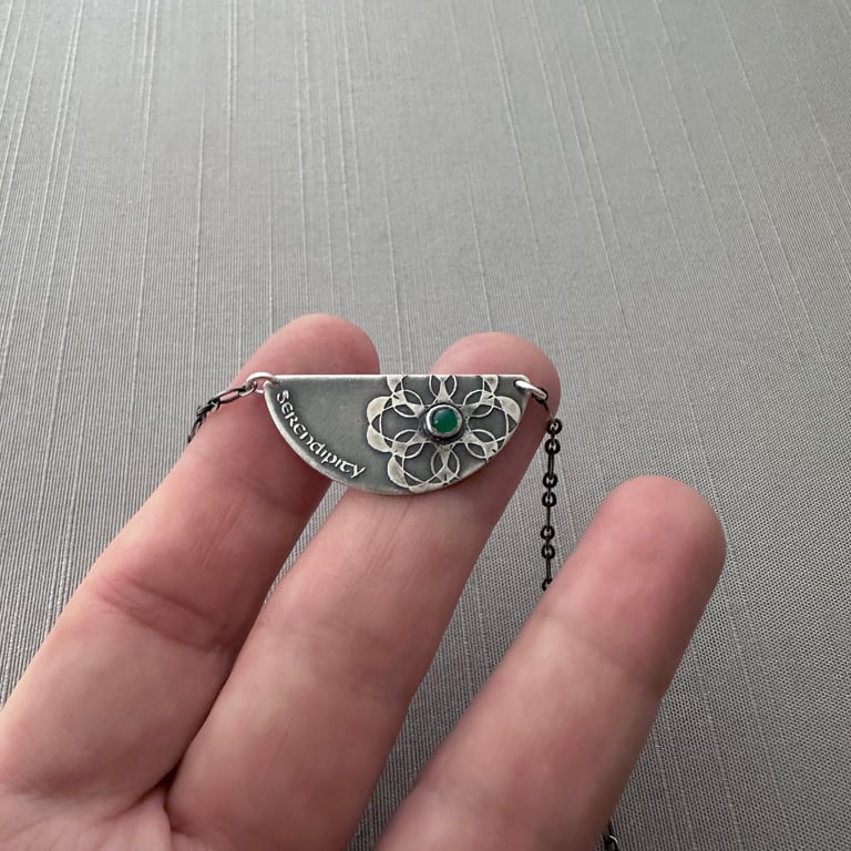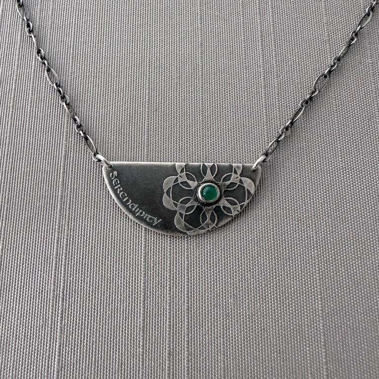 I've handwritten the word "serendipity" and etched it along with my hand drawn spiro flower motif into a hand cut sterling silver semicircle. A 3 mm green chalcedony cabochon is bezel set in the center of the flower design. This piece measures approximately 1-1/4" x 9/16" and has been given an oxidized, brushed finish. An 18" oxidized sterling silver chain is attached at the corners.