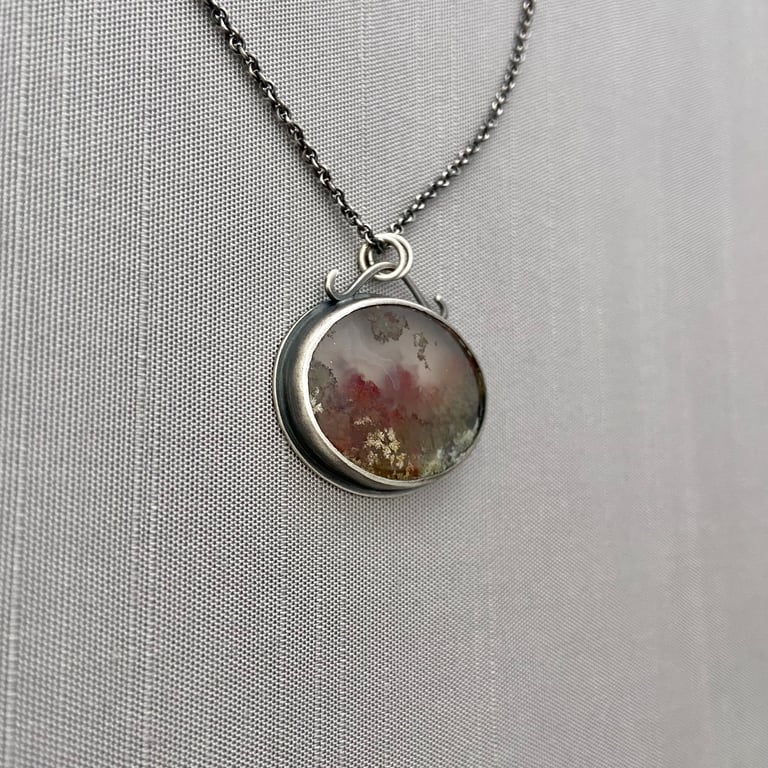 This hand fabricated pendant features a translucent oval moss agate cabochon. It has been bezel set in sterling silver. I've given the pendant an open back to allow light to shine through the translucent stone. The pendant measures approximately 1" x 1-1/4”. The silver setting has been given an oxidized, brushed finish and hangs from an oxidized sterling silver chain.
