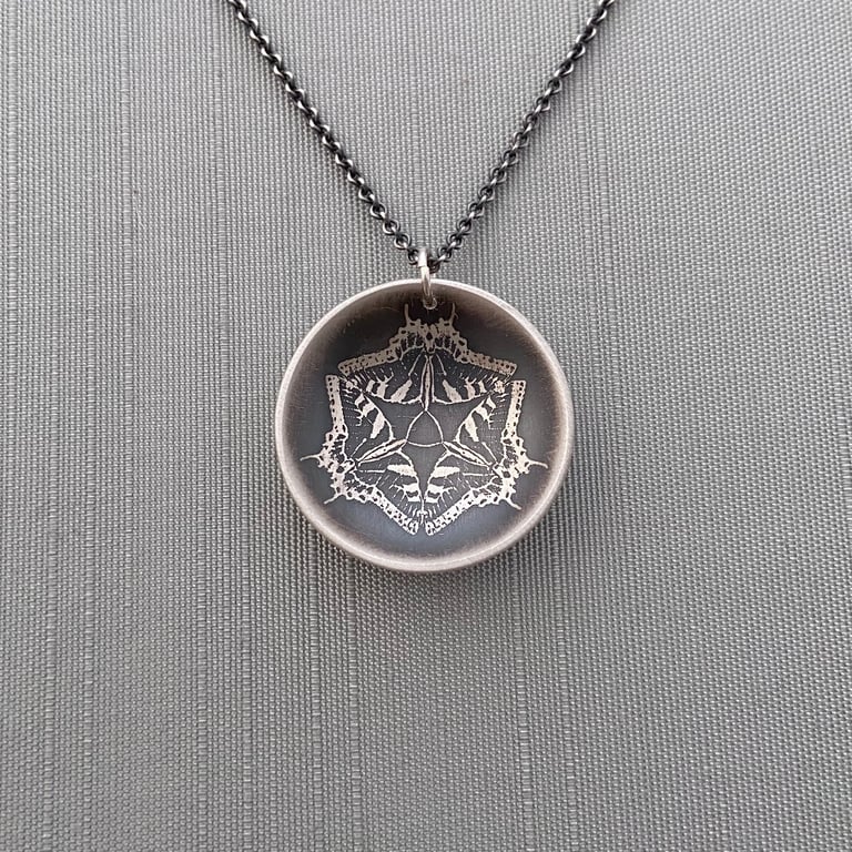 This sterling silver necklace features my eastern tiger swallowtail butterflies design etched into a hand formed sterling silver saucer. The saucer has been given an oxidized, brushed finish. It measures just over 1" across and hangs from a sterling silver chain. The sterling chain is available in either an oxidized silver finish or bright silver finish. The oxidized silver chain is pictured.