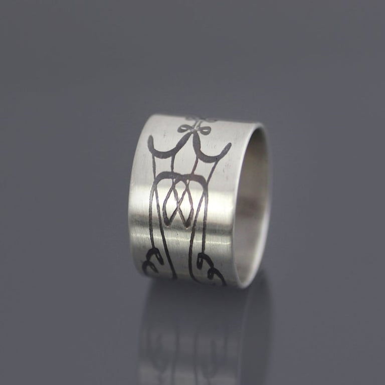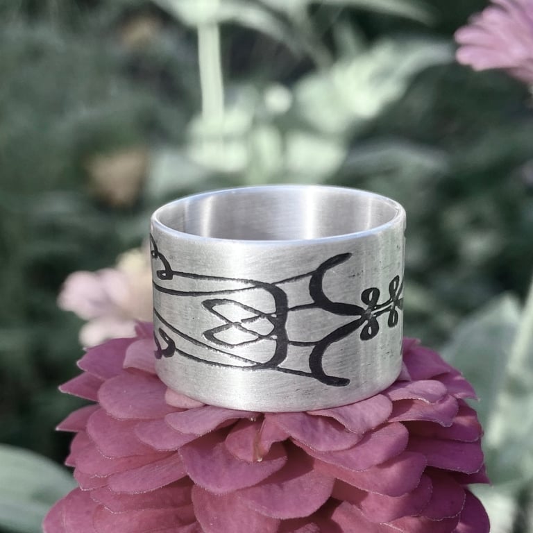 This wide sterling silver band is hand fabricated and features my hand drawn calligraphic flourish design that I've etched into the silver. I've oxidized the design and I've given this ring a brushed finish. The band is approximately 9/16" wide and is a US size 10-1/2, which is the only size available at this time. (Please keep in mind that a wide band will feel tighter than a thinner band of the same size.)