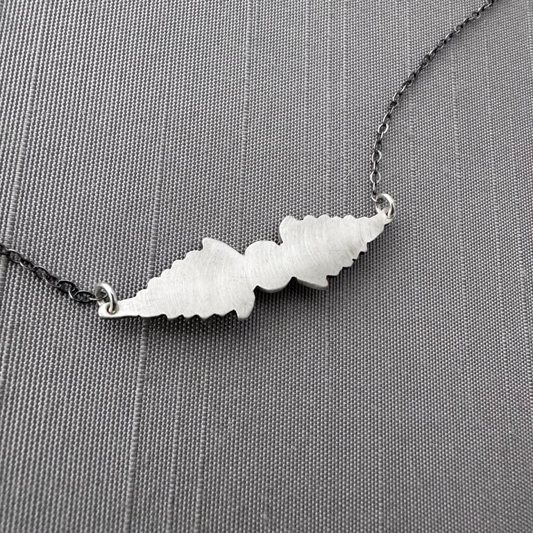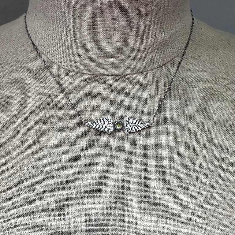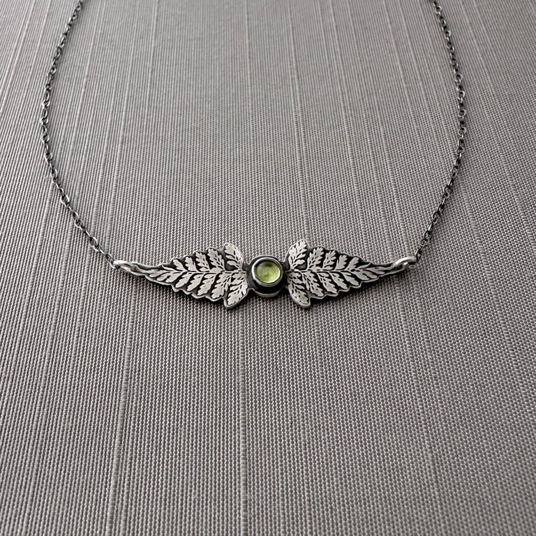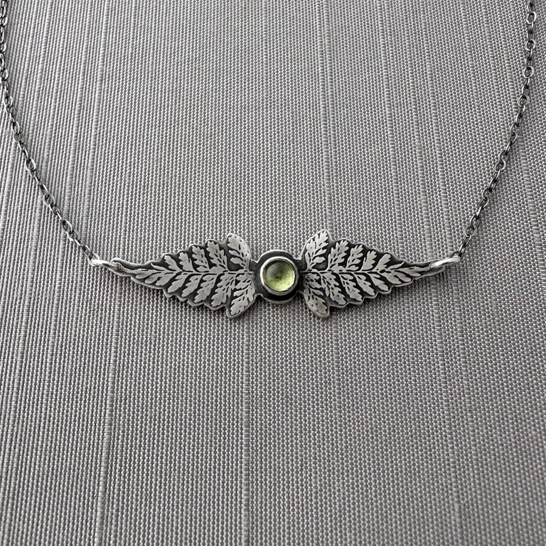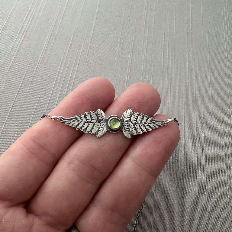 I’ve etched my fern design into this hand cut silver pendant and added a 4mm peridot cabochon bezel set between the two fern fronds. I’ve given this piece an oxidized, brushed finish. It measures approximately 1/2” x 1-3/4” and hangs from an oxidized sterling silver chain.