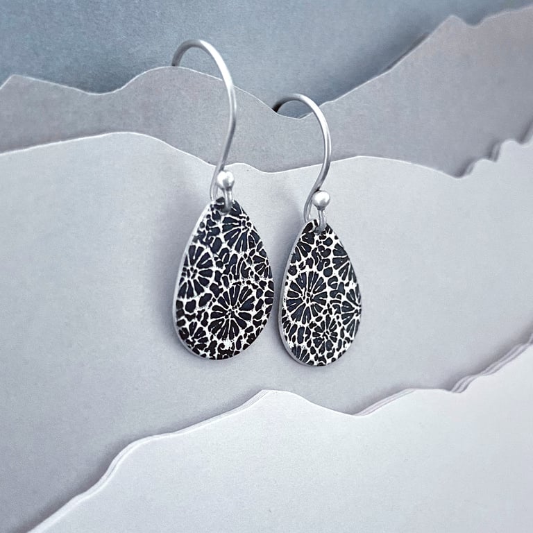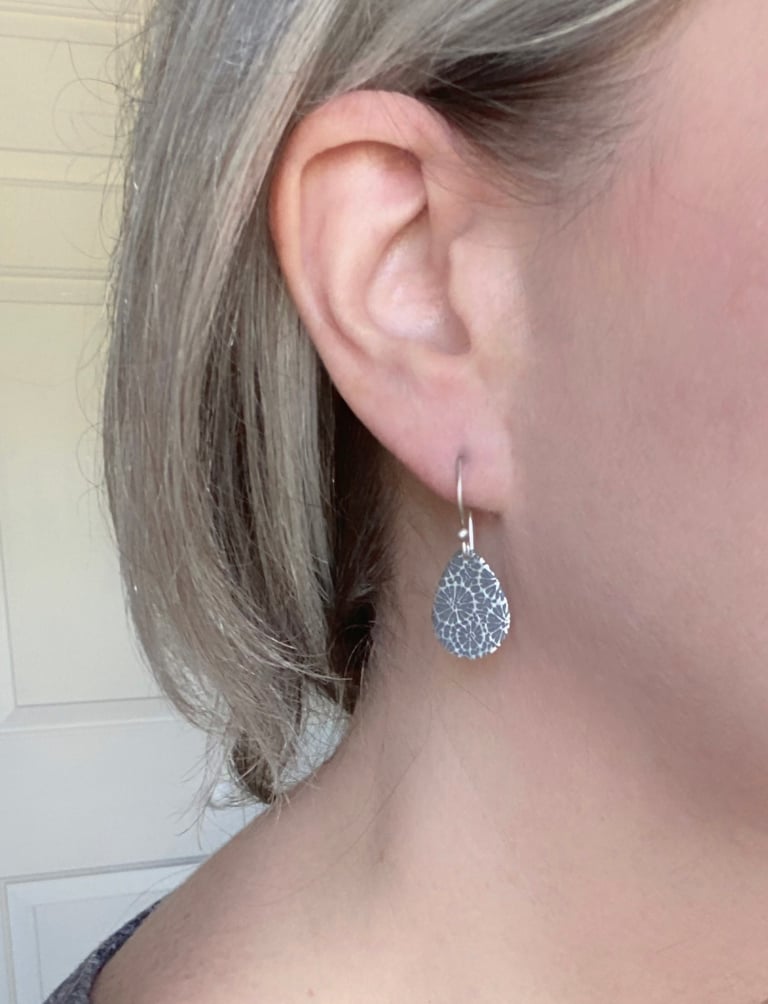These sterling silver teardrop earrings feature my fossil coral pattern etched into the silver. They have been given an oxidized, brushed finish. The teardrops measure approximately 1/2" x 3/4" and the total earring length is 1-3/8"