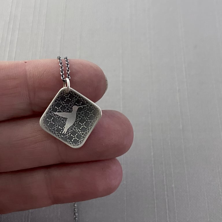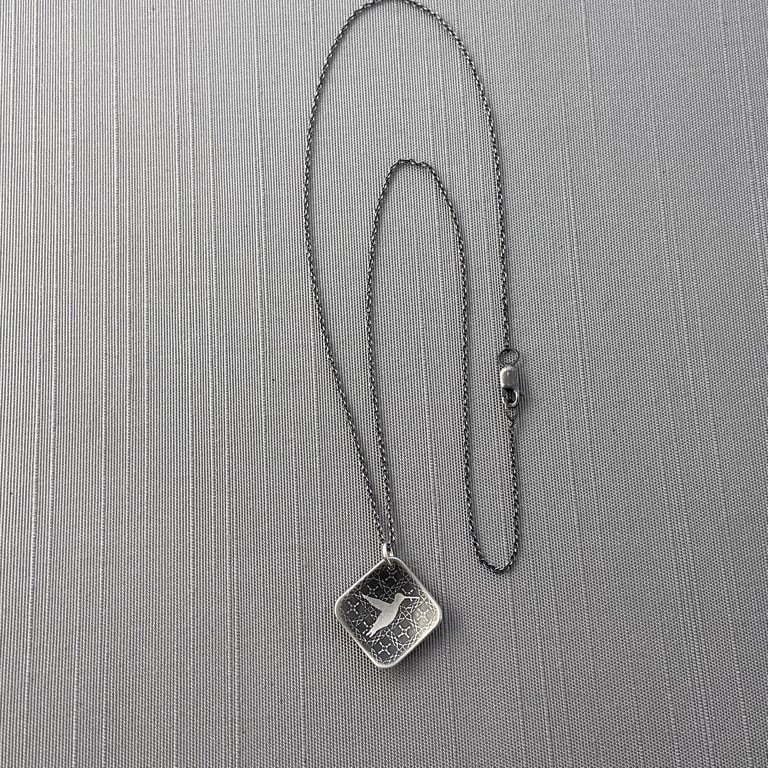 This sterling silver necklace features my etched hand drawn hummingbird with my etched background design inspired by Moroccan tile patterns. The pendant measures 3/4" x 3/4" and has been given a concave form. It has been given an oxidized, brushed finish. It hangs from an oxidized sterling silver chain.
