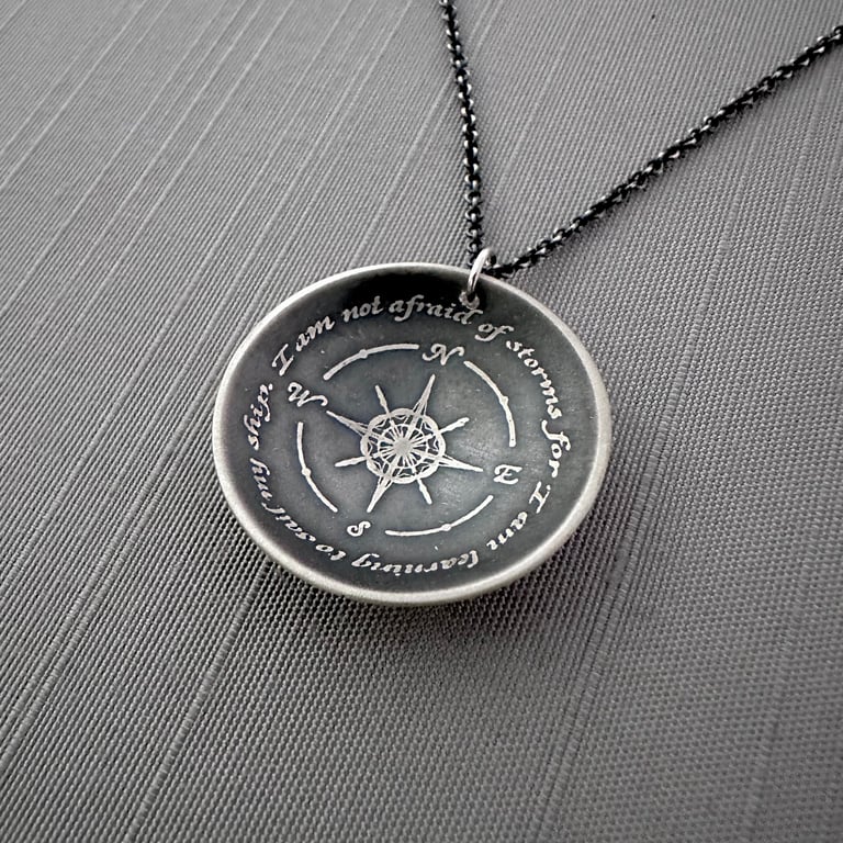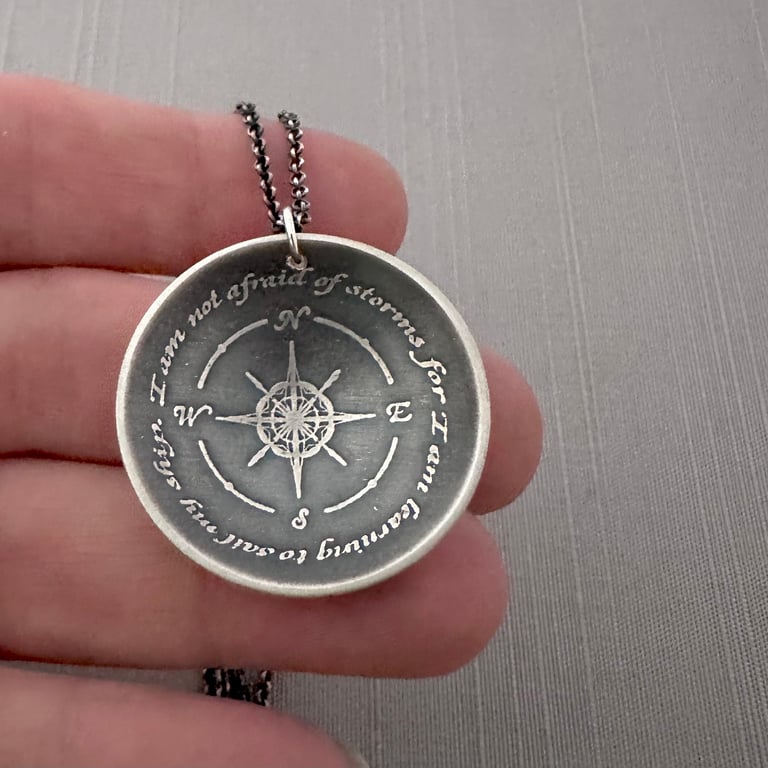 This sterling silver necklace features a quote by Louisa May Alcott: I am not afraid of storms, for I am learning to sail my ship. I've handwritten the words and etched them into the sterling silver pendant. My hand drawn antique style nautical compass rose is etched in the center of the piece, encircled by the words. I've given the pendant a concave form. A sterling silver tag etched with the author's name hangs near the clasp. I've given this piece an oxidized, brushed finish. The pendant measures approximately 1-3/16" in diameter and hangs from a 20" oxidized sterling silver chain.
