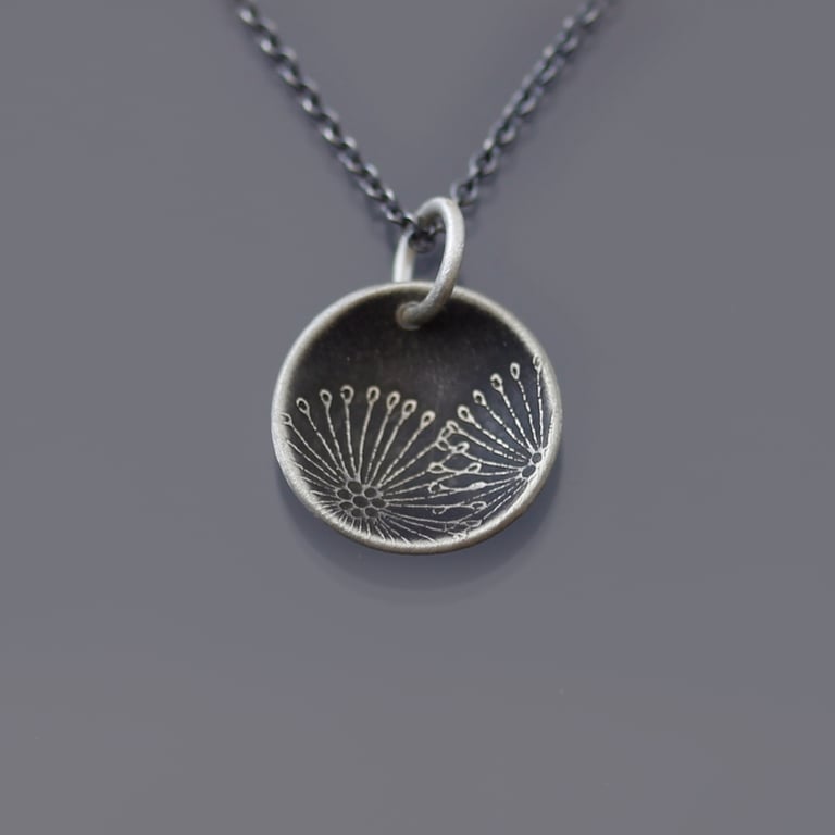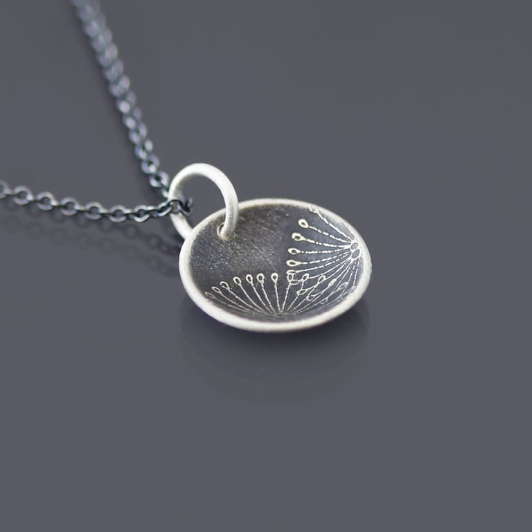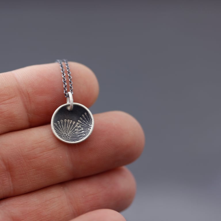 My tiny, hand drawn seed pod pattern is etched into a gently cupped sterling silver saucer. This piece has been given an oxidized, brushed finish. It measures just under 1/2" in diameter and hangs from an oxidized sterling silver chain.