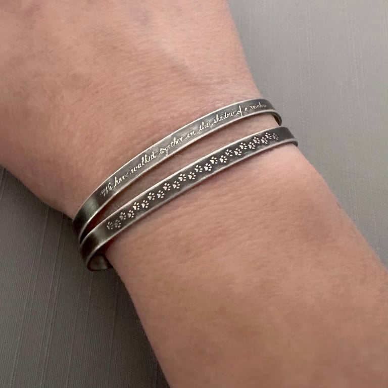 This handcrafted sterling silver cuff features my hand drawn paw prints etched into this hand formed oval bracelet. I've oxidized and hand finished the cuff to highlight the raised design and I've given it a brushed finish.