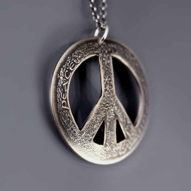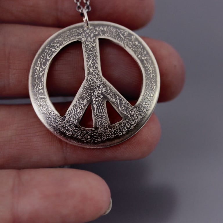 Created from my larger pen and ink artwork, this necklace features a wonderfully detailed, hand drawn peace symbol that I've etched into hand cut, slightly convex, hand formed, sterling silver pendant. The handwritten word "peace" is nestled among tiny details such a flowers, leaves, butterflies, snowflakes and other nature motifs that comprise the symbol and create a lovely texture. I've given the pendant an oxidized, brushed finish. It measures approximately 1-1/4" and hangs from a 20" oxidized sterling silver chain.