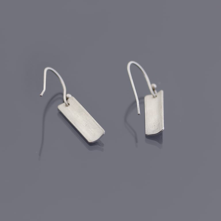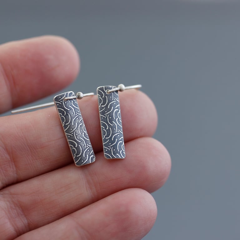 These earrings feature sections of my hand drawn stylized peony pattern etched into hand formed convex sterling silver rectangles. I've oxidized them and I've given them a brushed finish. They hang from sterling silver earwires. The total length is approximately 1-1/4".
