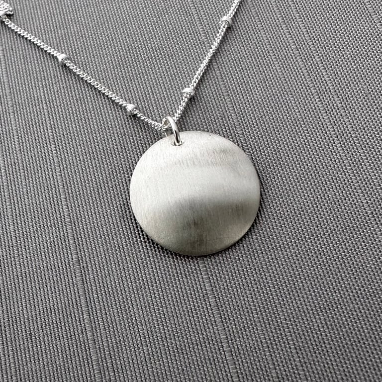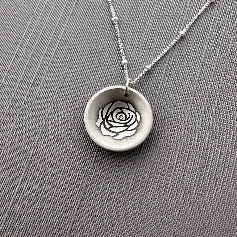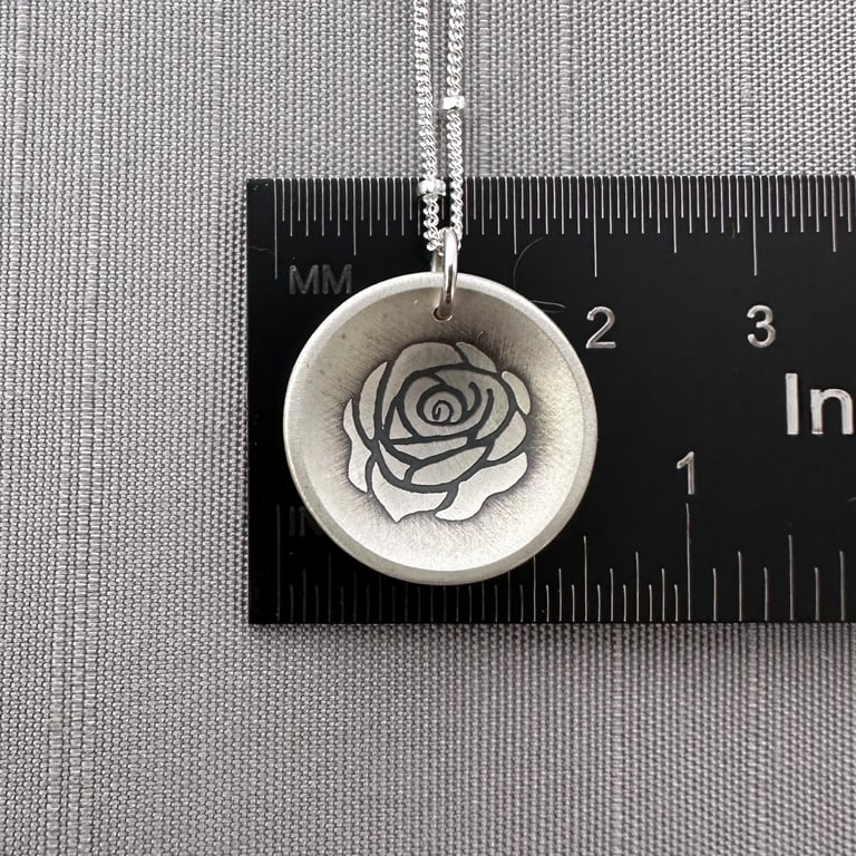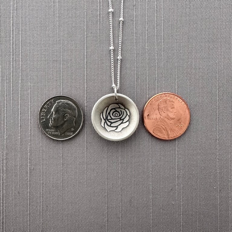 This necklace features my hand drawn rose etched into a hand formed sterling silver saucer pendant. I've given this piece a lightly oxidized, brushed finish. It measures 5/8” in diameter and hangs from a sterling silver chain. The sterling silver chain is available in either an oxidized (darkened) finish or bright silver finish. The bright silver chain is pictured.