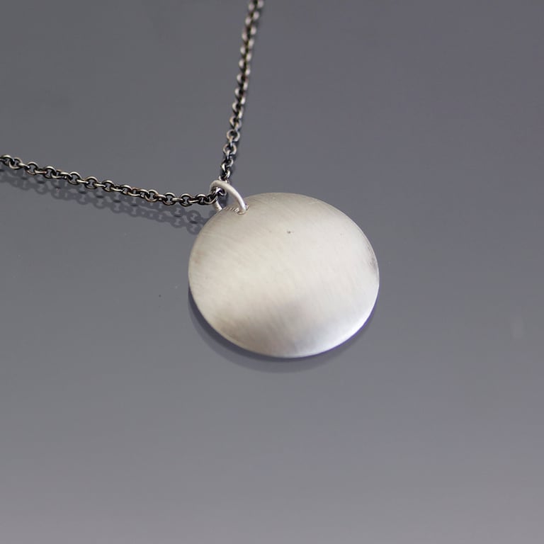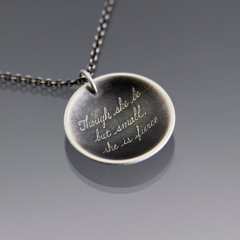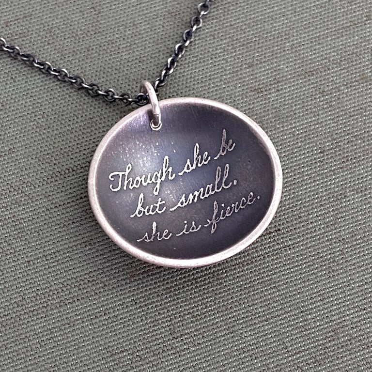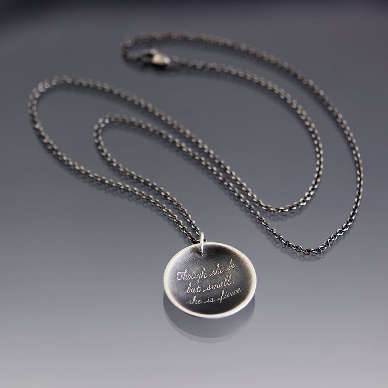 This sterling silver necklace features a quote by Shakespeare: "though she be but small, she is fierce" that has been handwritten in calligraphy and etched into this hand cut, gently cupped, sterling silver pendant.T he piece has been given an oxidized, brushed finish. The pendant measures just under 7/8" in diameter and hangs from an oxidized sterling silver chain.