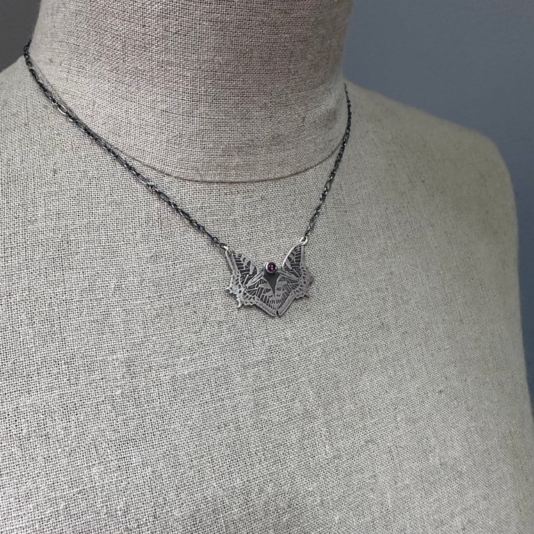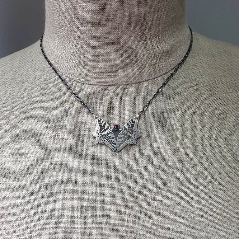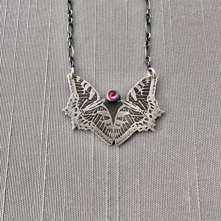 I’ve etched my Tiger swallowtail butterflies design into a hand cut sterling silver pendant. A 3mm pink tourmaline cabochon is nestled between the two butterflies. The silver has been given an oxidized, brushed finish. The pendant measures approximately 1” x 1-1/4” and hangs from an oxidized sterling silver chain.