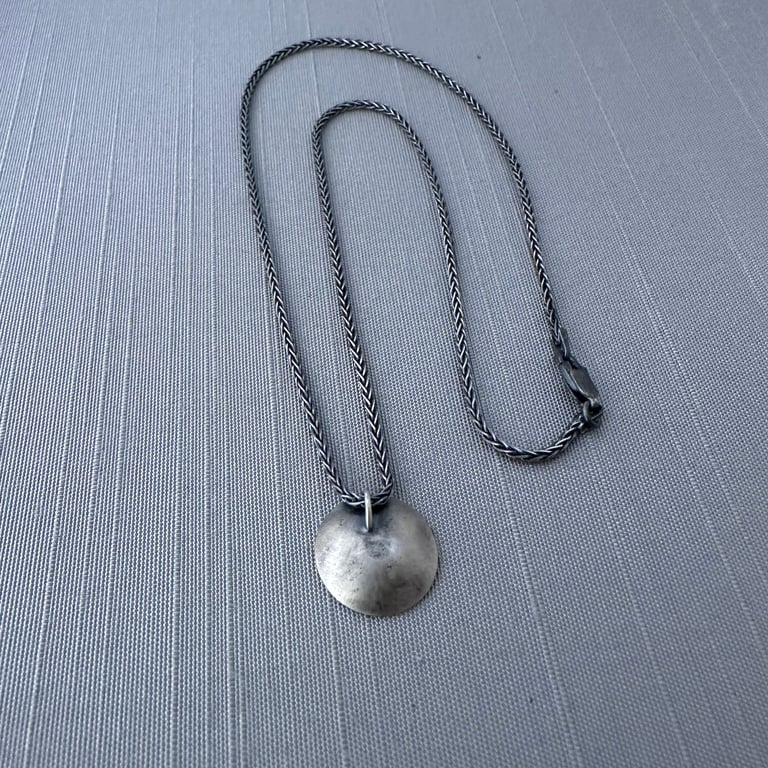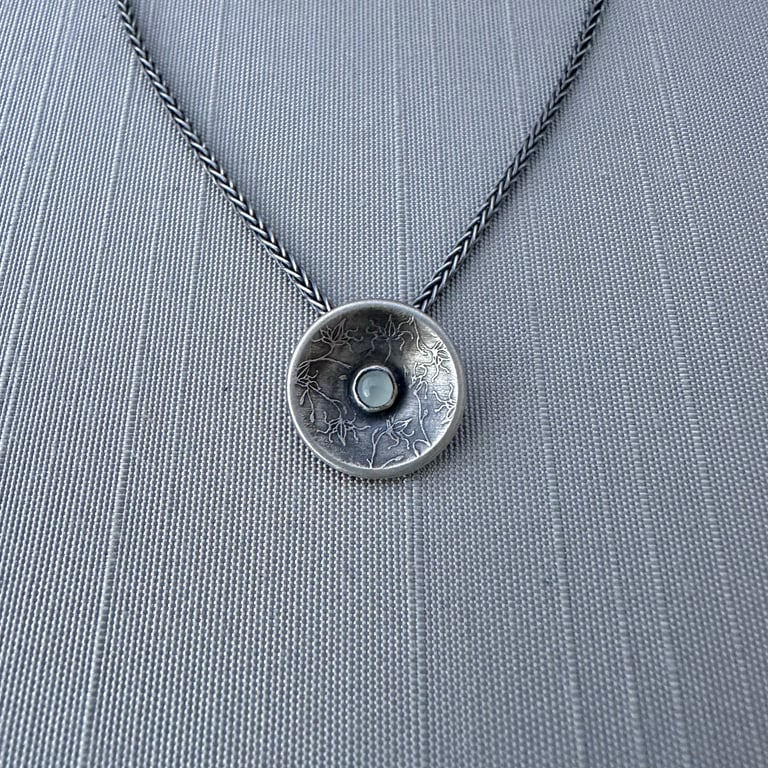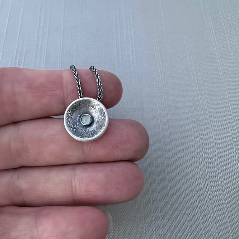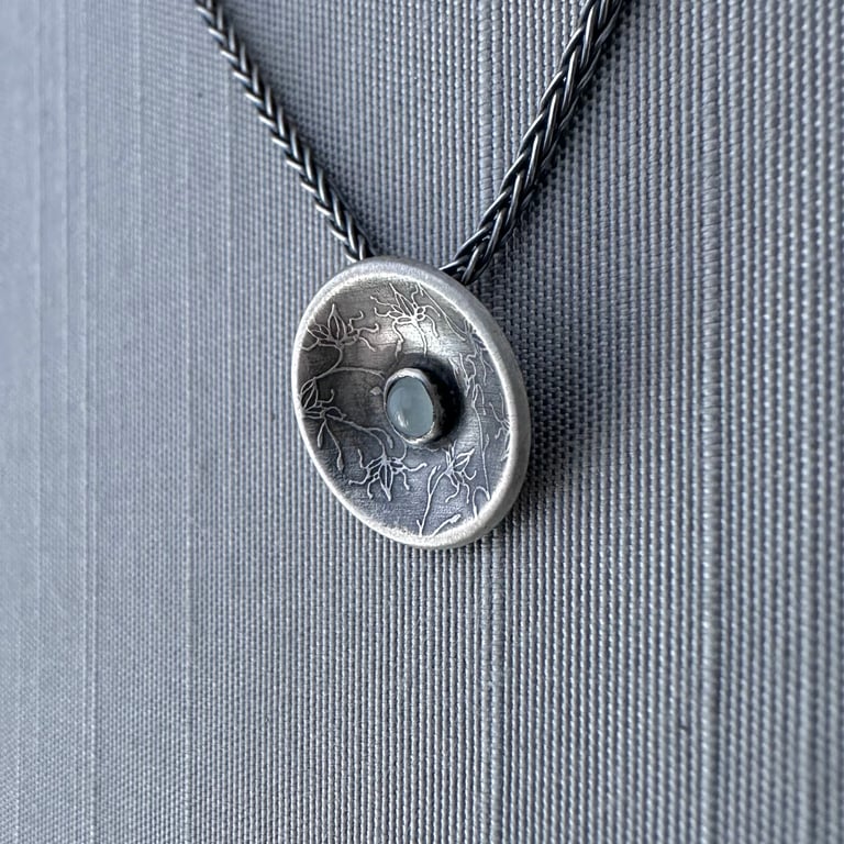 This sterling silver necklace features a 3 mm aquamarine cabochon that I've set in the center of a hand formed sterling silver saucer etched with my original vine lace design. I've given this piece an oxidized, brushed finish. The pendant measures approximately 9/16" in diameter and hangs from an oxidized sterling silver chain.