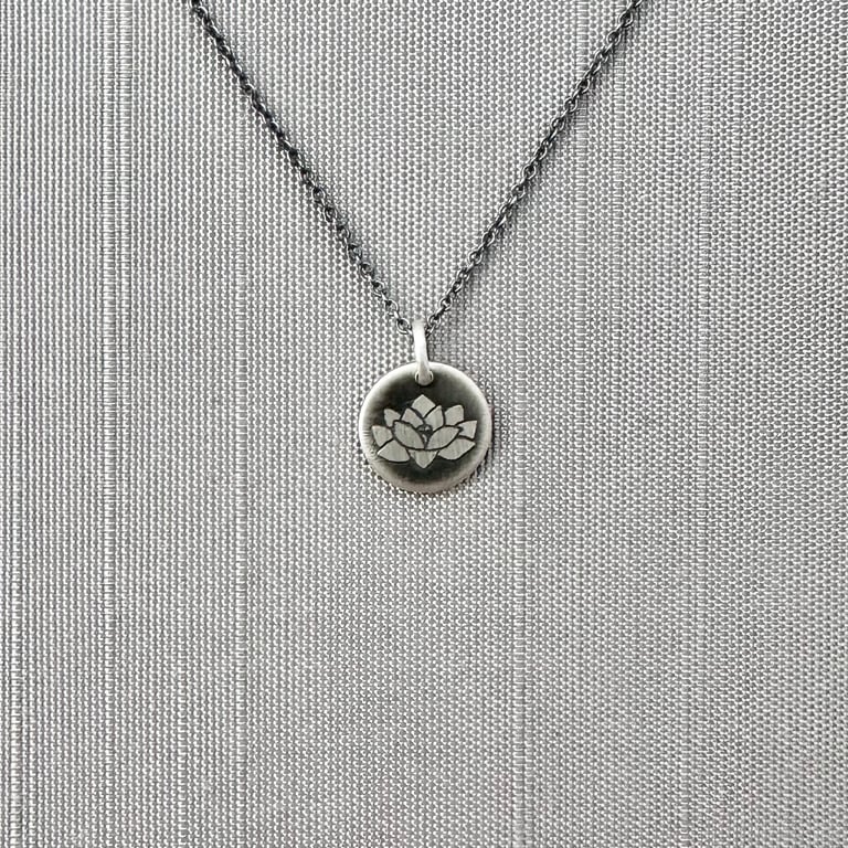 I've etched my hand drawn lotus blossom design into a tiny sterling silver circle. The piece is oxidized and hand finished to highlight the raised design. The circle measures 3/8" in diameter and hangs from a dainty sterling silver chain, available in either an oxidized (darkened) finish or bright silver finish. The oxidized chain is pictured.