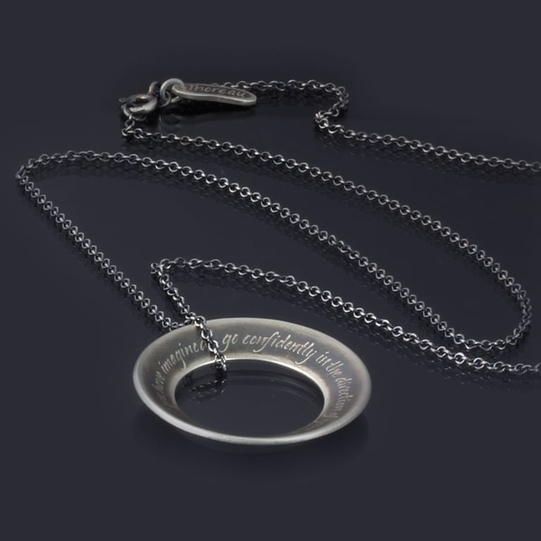 This handcrafted necklace features a quote by Thoreau: "Go confidently in the directon of your dreams. Live the life you have imagined." I've hand written the words and etched them around the edge of a hand cut, sterling silver, open circle pendant and I've given it a concave form. I've also lgihtly etched the author's name onto a tiny, hand cut silver tag and attached it near the clasp. This piece has been oxidized and hand finished to highlight the raised lettering. The pendant measures approximately 1-3/16" in diameter. It slides along a 20 inch oxidized sterling silver chain; it can flip back and forth between the front and the brushed silver backside, which is also lovely.
