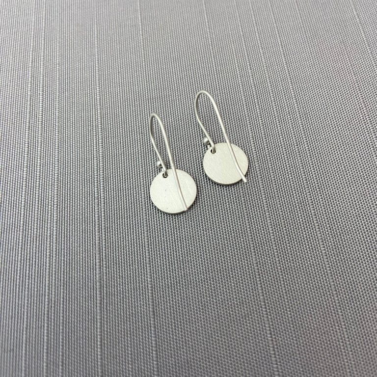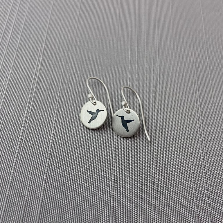 I've etched my tiny hand drawn hummingbird into hand formed sterling silver saucers. I've oxidized the hummingbirds and I’ve given the earrings a brushed finish. The small circles hang from sterling silver earwires. The circle diameter is approximately 3/8" and the total length of each earring is approximately 7/8".