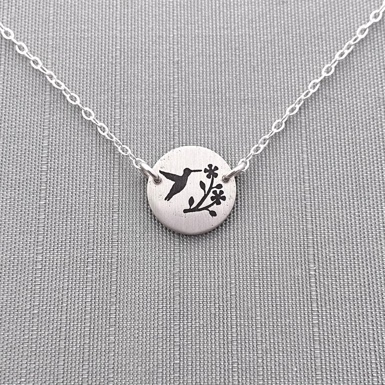 I've etched my hand drawn hummingbird and flower design into this tiny sterling silver circle. The design is oxidized and the piece has been given a brushed finish. The circle measures approximately 1/2" in diameter. A delicate sterling silver chain is attached to the sides. The sterling silver chain is available in either a bright silver finish or oxidized (dark) finish. The bright silver chain is pictured.