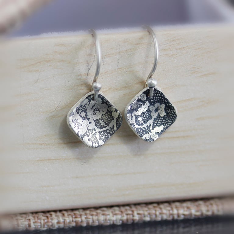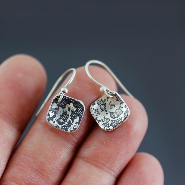 A delicate vintage lace pattern is etched into tiny sterling silver diamond shapes.They've been givena concave form and an oxidized, brushed finish to highlight the lace pattern. Each measures approximately 1/2" across. The total earring length is approximately 1". Pattern placement will vary.