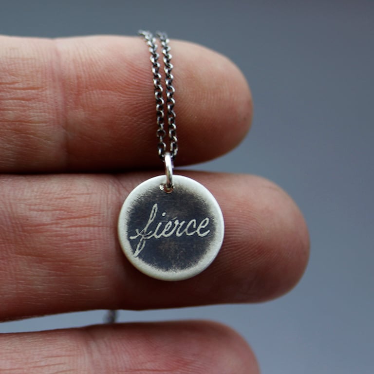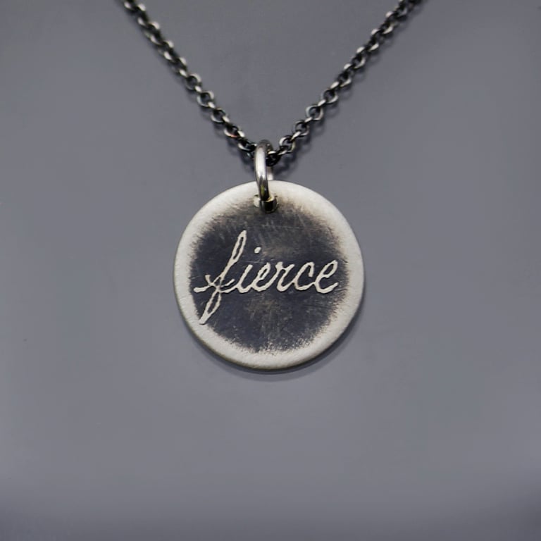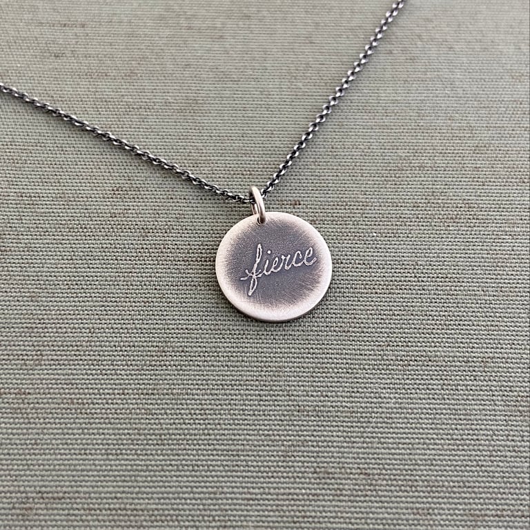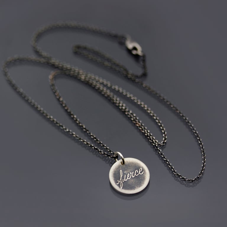 The word "fierce" is handwritten and etched into a sterling silver pendant. The piece has been given an oxidized, brushed finish. This tiny pendant measures 1/2" in diameter and hangs from a sterling silver chain. The sterling chain is available in either an oxidized (darkened) finish as pictured, or a bright silver finish.