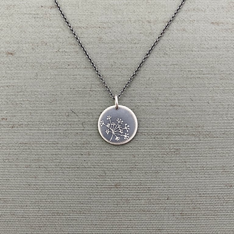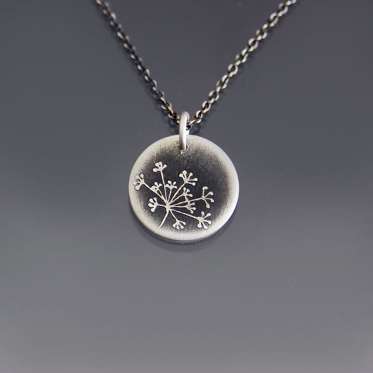 A hand drawn queen anne's lace design is etched into a sterling silver pendant. This piece has been given an oxidized, brushed finish. This tiny pendant measures 1/2" in diameter and hangs from a sterling silver chain. The sterling silver chain is available in either an oxidized (darkened) finish or bright silver finish. The oxidized chain is pictured.