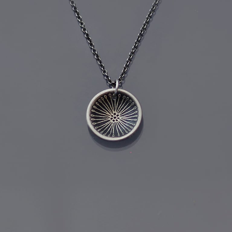 A tiny, hand drawn seed pod design is etched into a gently cupped sterling silver saucer. This piece has been given an oxidized, brushed finish. It measures just under 1/2" in diameter and hangs from an oxidized sterling silver chain.