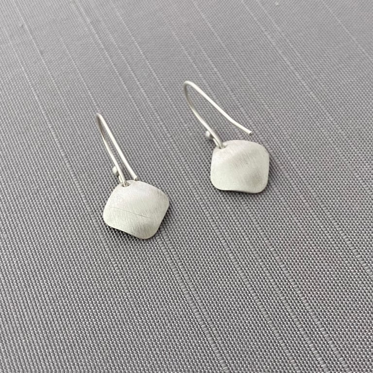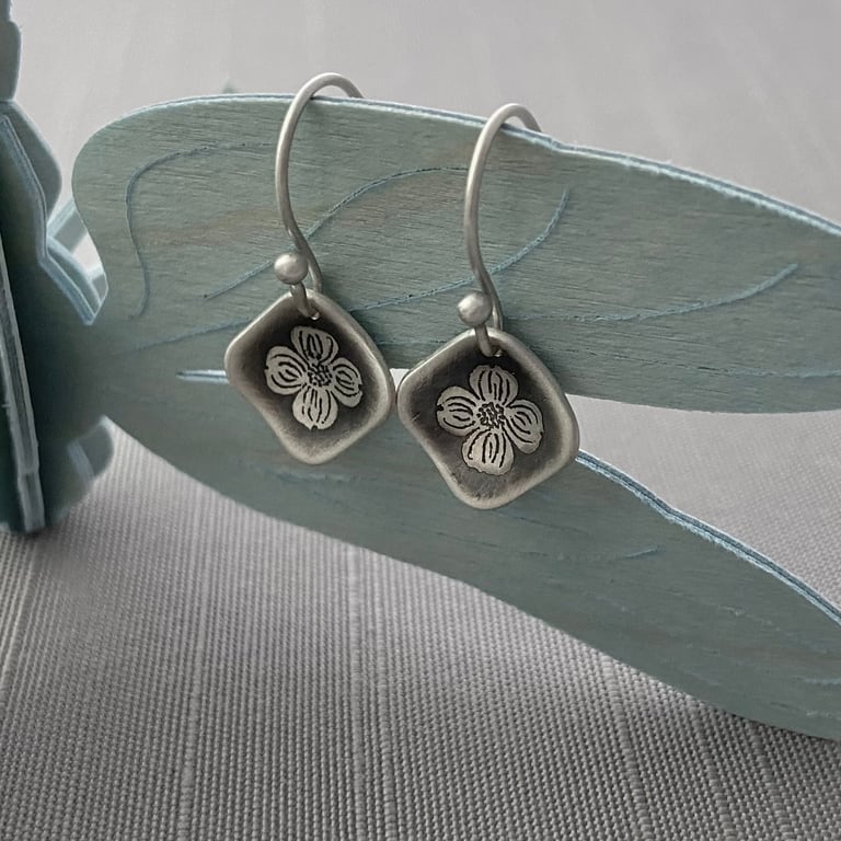 I've etched my hand drawn dogwood blossoms into tiny sterling silver diamond shapes. I've given them a concave form and an oxidized, brushed finish. Each measures approximately 1/2" across. The total earring length is just over 1".