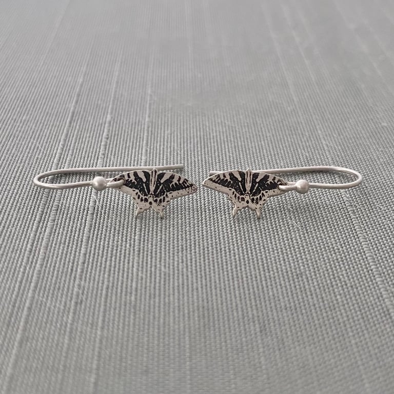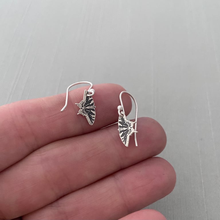 These very tiny, beautifully detailed, sterling silver earrings are etched with my Eastern Tiger Swallowtail butterfly design and hand cut from a sheet of sterling silver. They have been oxidized and then hand finished to highlight the etched design. I've given them a brushed finish. The butterflies hang from sterling silver ear wires. Each tiny butterfly measures approximately 1/2" x 1/4" and the total earring length is approximately 15/16 inch.