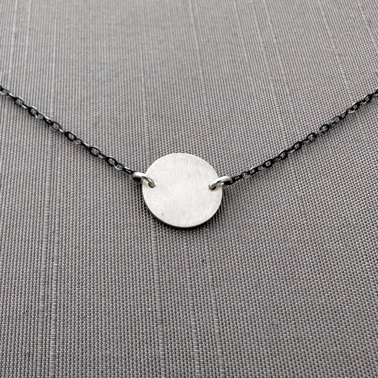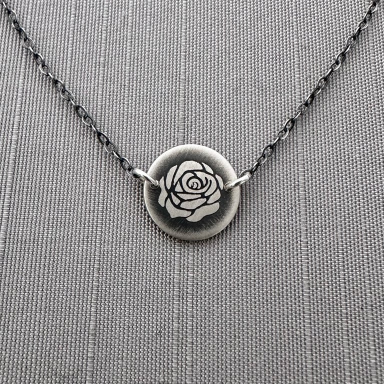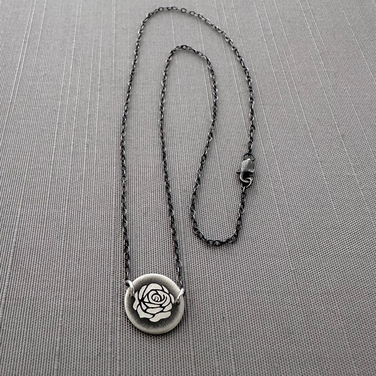 This necklace features my hand drawn rose design etched into a tiny sterling silver circle. The piece has been given an oxidized, brushed finish. The circle measures approximately 1/2" in diameter and hangs from a sterling silver chain. The sterling silver chain is available in either an oxidized (darkened) finish or bright silver finish. The oxidized chain is pictured.